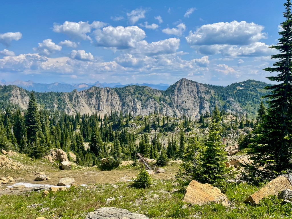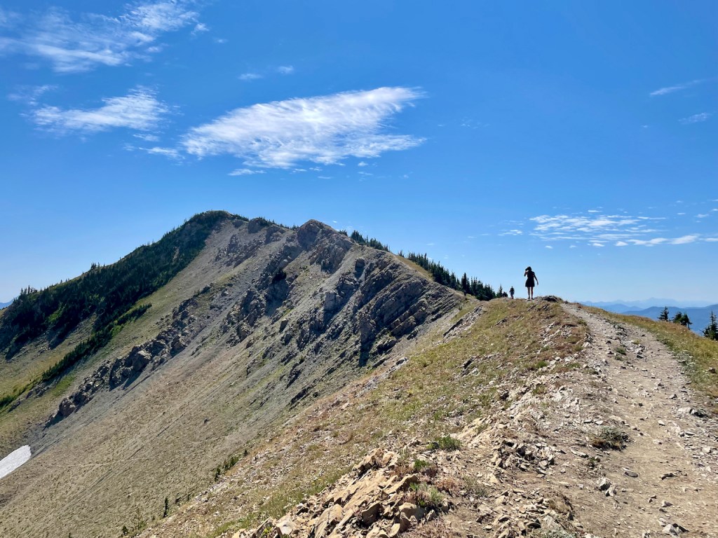Getting to Jewel is the initial adventure. I am thrilled by wild roads. Four of us pack 2017 Jeep Wrangler. We begin the ascent up the narrow, winding gravel road, unsure of whether or not we will be blocked by the impact of seasonal storms. The road is barely wide enough to hold one vehicle, so being in the Jeep feels comforting, considering the cliffside drops and ruggedness of the track. On our left side, the Flathead Valley plays peek-a-boo with the tree-covered slopes of Jewel. It takes about half hour to make the bumpy, seven-mile journey before we arrive at the trailhead aptly called “Camp Misery.”